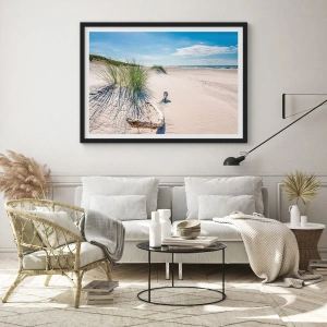 Affiche dans un cadre noir - Poster - Plage avec dunes, herbe et branches au soleil - 50x70cm - La plus belle? La Baltique - Décoration murale moderne pour le salon et la chambre ARTTOR