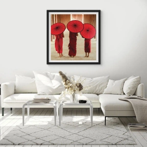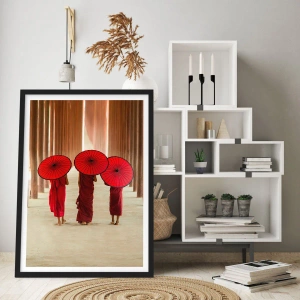 Affiche dans un cadre noir - Poster - Trois moines avec des parapluies rouges dans l'architecture traditionnelle - 70x50cm - Sur la route du pays pure - Décoration murale moderne pour le salon et la chambre ARTTOR