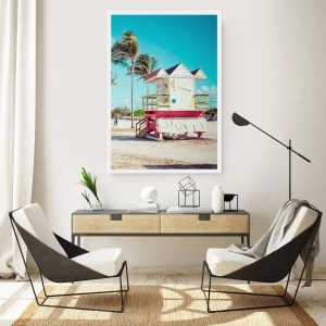 Affiche - Poster - Un poste de sauveteur coloré sur une plage avec des palmiers et un ciel bleu - 50x70cm - Une belle journée devant toi - Décoration murale moderne pour le salon et la chambre ARTTOR