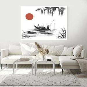 Affiche - Poster - Une peinture minimaliste d'un pêcheur dans un bateau avec un soleil rouge. - 50x70cm - Après-midi asiatique - Décoration murale moderne pour le salon et la chambre ARTTOR