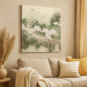 • Ce tableau représente des flamants roses dans leur environnement naturel, rendu à l'aquarelle. Les couleurs subtiles et les détails délicats apportent une touche harmonieuse et artistique à cet intérieur.
