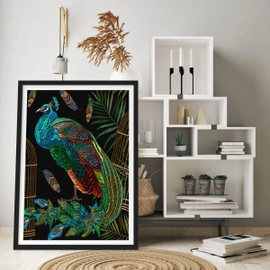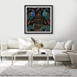 Affiche dans un cadre noir - Poster - Paons à côté d'une cage dorée sur fond noir - 100x70cm - En robes royales - Décoration murale moderne pour le salon et la chambre ARTTOR