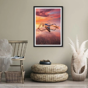Affiche dans un cadre noir - Poster - Un bateau sur une eau calme au coucher du soleil - 100x70cm - Le calme d'une soirée tropicale - Décoration murale moderne pour le salon et la chambre ARTTOR