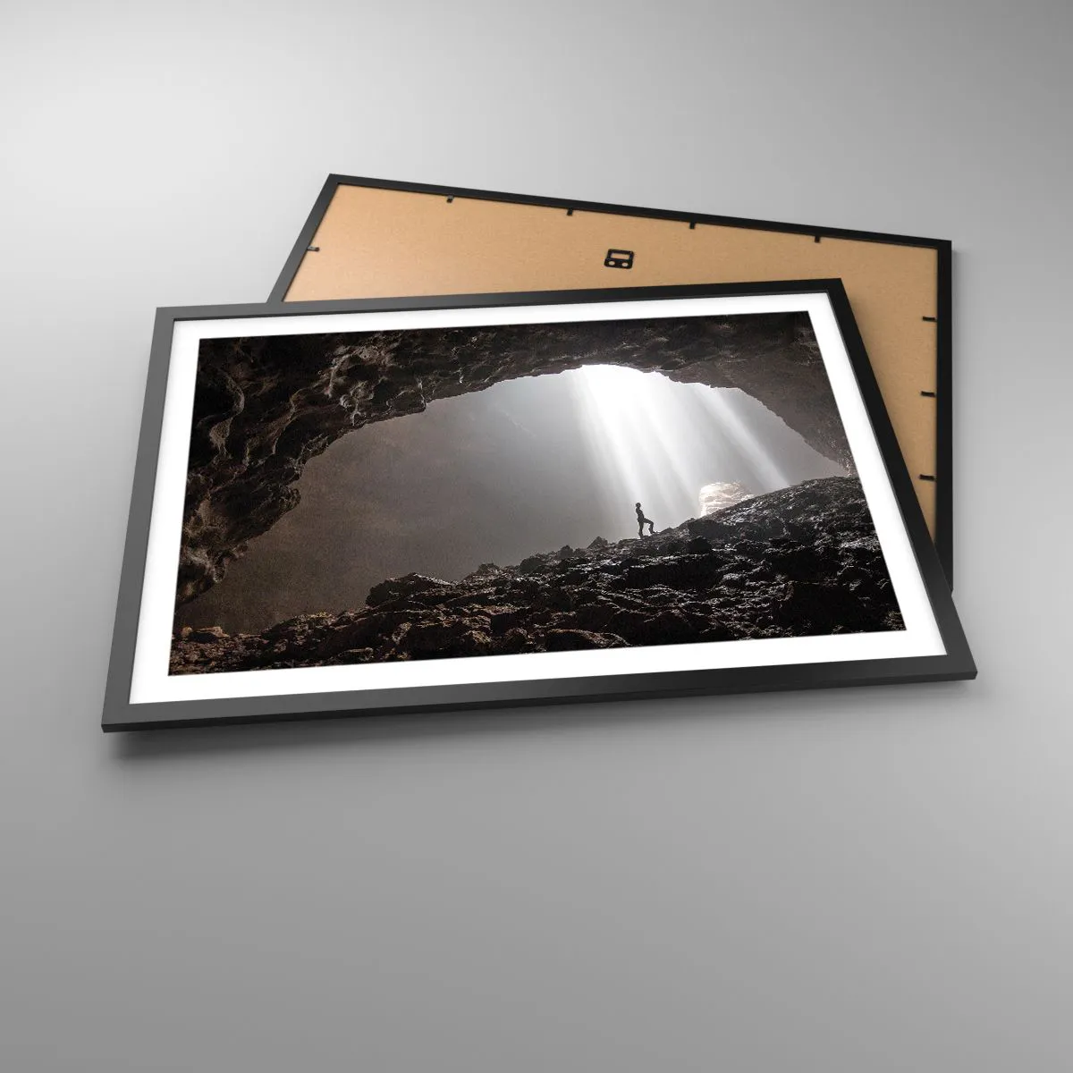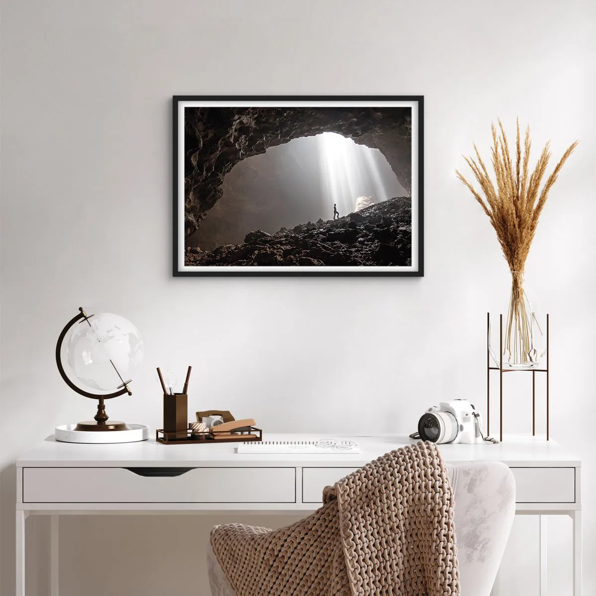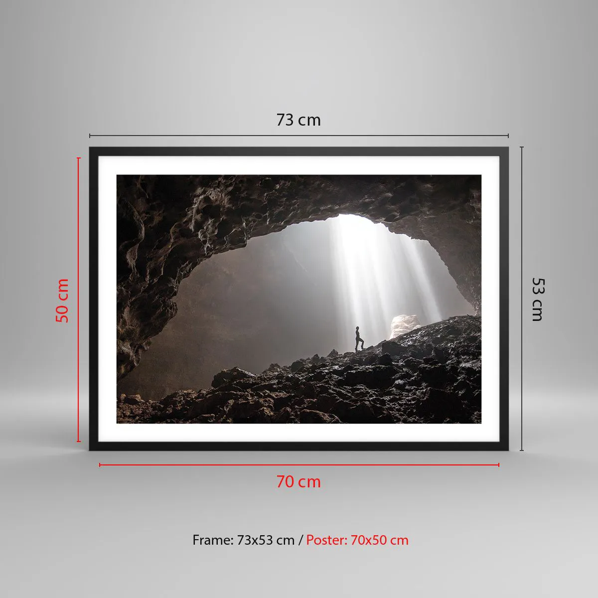 Affiche dans un cadre noir - Poster - Une figure dans une grotte éclairée par des rayons de lumière - 70x50cm - Grotte lumineuse - Décoration murale moderne pour le salon et la chambre ARTTOR