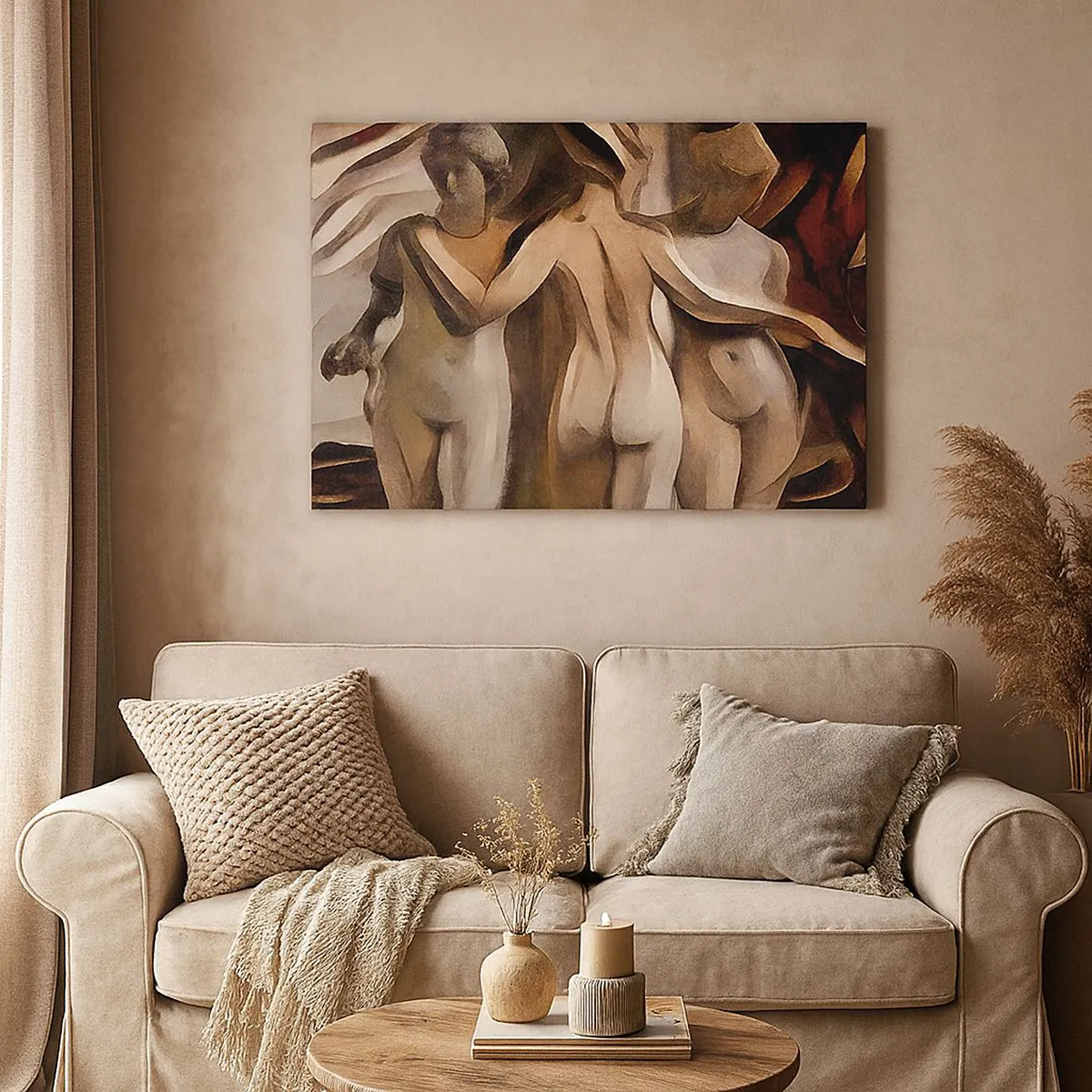 Impression sur toile - Image sur toile - Une scène abstraite avec trois personnages aux couleurs chaudes. - 120x80cm - Trois Grâces 2.0 - Décoration murale moderne pour le salon et la chambre ARTTOR