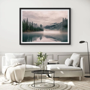 Affiche dans un cadre noir - Poster - Une forêt brumeuse se reflétant dans un lac calme - 70x50cm - Reflet dans le brouillard - Décoration murale moderne pour le salon et la chambre ARTTOR
