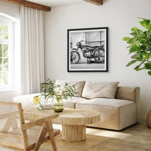 - L'affiche « Moto rétro » représente une moto vintage classique posée sur un mur en bois. La palette de couleurs monochromes souligne son caractère brut et nostalgique. Elle est fournie avec un cadre noir.