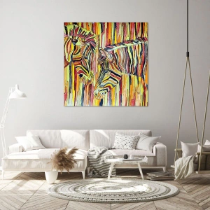 • Ce tableau représente deux zèbres dans une interprétation artistique, entourés de rayures abstraites et colorées. Les couleurs intenses et le style original créent une composition unique et moderne.