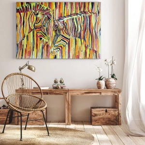 Impression sur toile - Image sur toile - Zèbres colorés sur fond de rayures abstraites - 70x50cm - Et donc toi aussi... - Décoration murale moderne pour le salon et la chambre ARTTOR