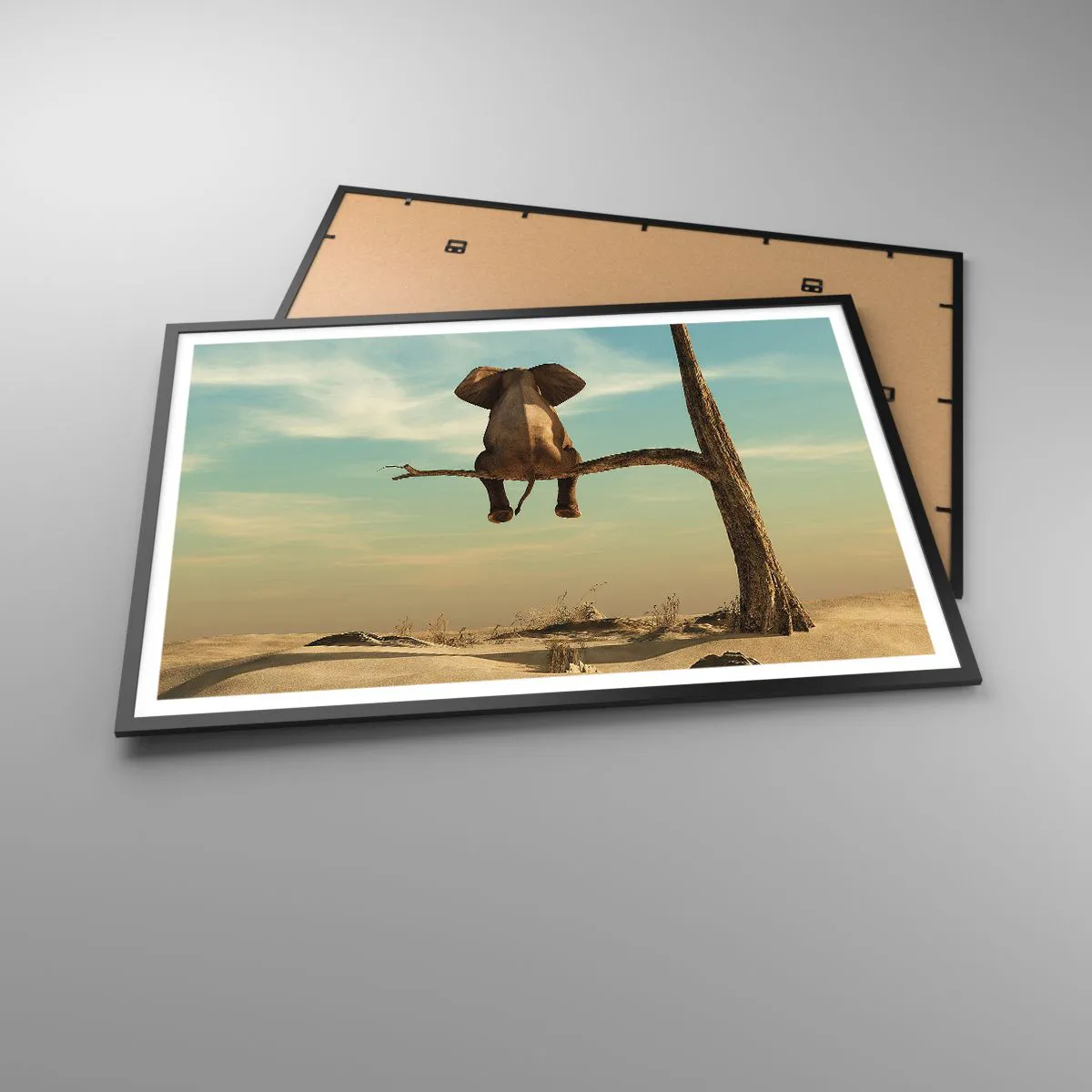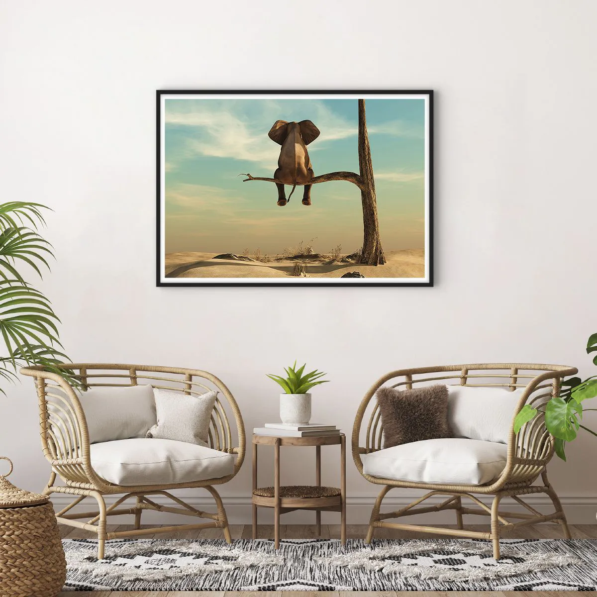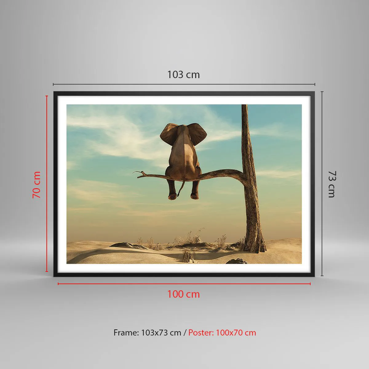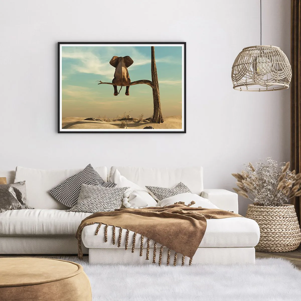 Affiche dans un cadre noir - Poster - Un éléphant assis sur une branche surplombant un paysage désertique - 100x70cm - Nouveau point de vue - Décoration murale moderne pour le salon et la chambre ARTTOR
