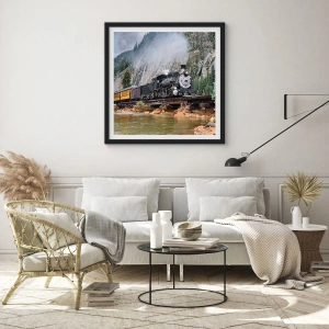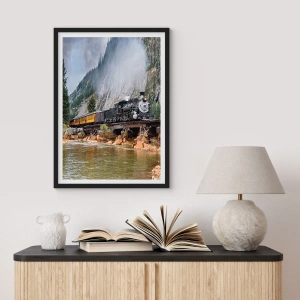 Affiche dans un cadre noir - Poster - Une locomotive à vapeur sur un pont entouré de montagnes et d'une rivière dans un paysage pittoresque. - 50x70cm - Et lui jusqu'où? Jusqu'où? - Décoration murale moderne pour le salon et la chambre ARTTOR