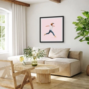 Affiche dans un cadre noir - Poster - Une silhouette en train de courir avec une tête d'oiseau sur un fond rose - 50x70cm - Une pincée d'absurdité - Décoration murale moderne pour le salon et la chambre ARTTOR
