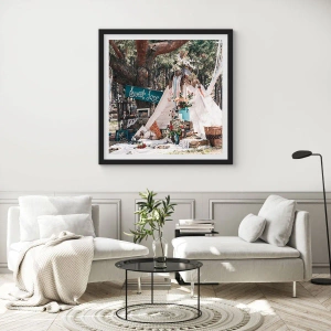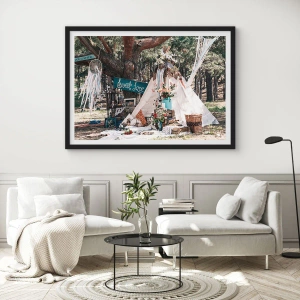 Nous vous présentons l'affiche « Faites l'amour… », qui capture de manière unique l'essence du style bohème. L'image présente des détails soignés, tels qu'une tente décorée de fleurs, des éléments naturels et l'inscription « Sweet Love », qui créent une composition harmonieuse. C'est une proposition pleine de romantisme, de chaleur et de subtilité.