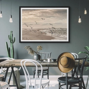 Affiche dans un cadre noir - Poster - Une mouette en vol au-dessus d'un paysage balnéaire - 70x50cm - Le bruit de la mer, le chant des oiseaux - Décoration murale moderne pour le salon et la chambre ARTTOR