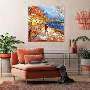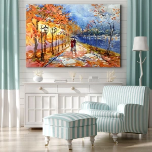 Impression sur toile - Image sur toile - Une promenade d'automne dans le parc au bord de la rivière sous un parasol - 120x80cm - Ensemble jusqu'au bout du temps - Décoration murale moderne pour le salon et la chambre ARTTOR