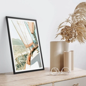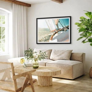 Affiche dans un cadre noir - Poster - Un yacht en pleine mer avec vue sur les montagnes - 100x70cm - Toutes voiles dehors - Décoration murale moderne pour le salon et la chambre ARTTOR
