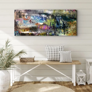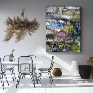 La palette de couleurs de l'œuvre est intense et variée, apportant une énergie positive à l'intérieur et animant l'espace. L'association du texte et des formes abstraites confère à ce tableau un caractère unique qui s'intègre parfaitement aux intérieurs modernes.