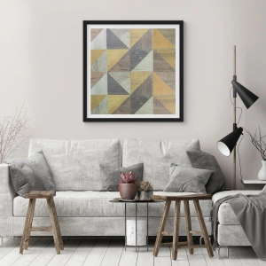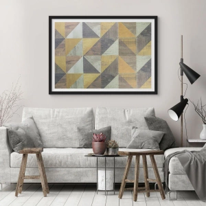 L'affiche « À l'angle d'un triangle » est une décoration sophistiquée ornée d'un motif géométrique dans les tons or et gris. L'harmonie des couleurs et la symétrie du motif lui confèrent élégance et caractère unique, s'intégrant parfaitement à divers styles d'intérieur.