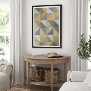 - Une affiche au motif géométrique aux tons dorés et gris. Un motif unique pour un intérieur moderne et élégant.
