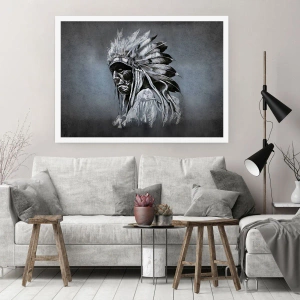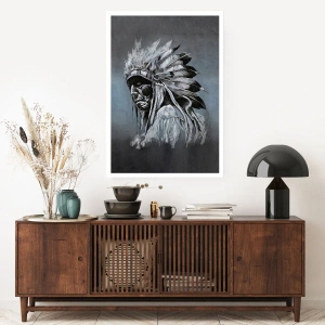 Affiche - Poster - Portrait d'un chef indien portant une coiffe de plumes sur fond gris - 50x70cm - Retour aux sources - Décoration murale moderne pour le salon et la chambre ARTTOR