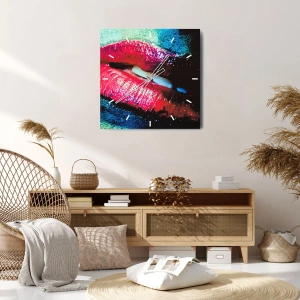 Le cadran présente un gros plan de lèvres dans des tons intenses de rose et de bleu, créant un effet dynamique et expressif. Cette composition unique s'intègre parfaitement aux tendances artistiques et de décoration intérieure modernes.