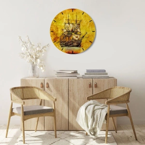 - Le motif graphique d'un voilier sur fond doré crée une composition décorative classique et élégante. Cette horloge ronde est parfaite pour les intérieurs de style vintage ou nautique.