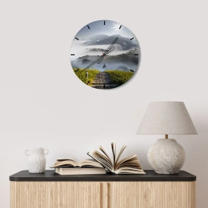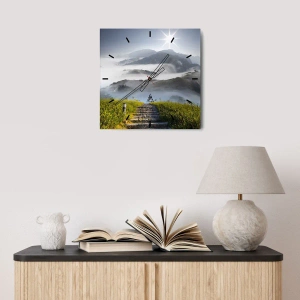 - Une horloge murale représentant un escalier menant aux montagnes dans un paysage brumeux illuminé par le soleil. Idéale pour les amoureux de la nature et des intérieurs paisibles.