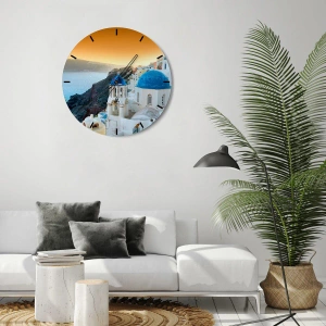 Horloge murale - Pendule murale - Vue de Santorin avec des bâtiments blancs et une mer bleue - 30x30cm - Santorin - blotti contre les rochers - Décoration murale moderne pour le salon et la chambre ARTTOR