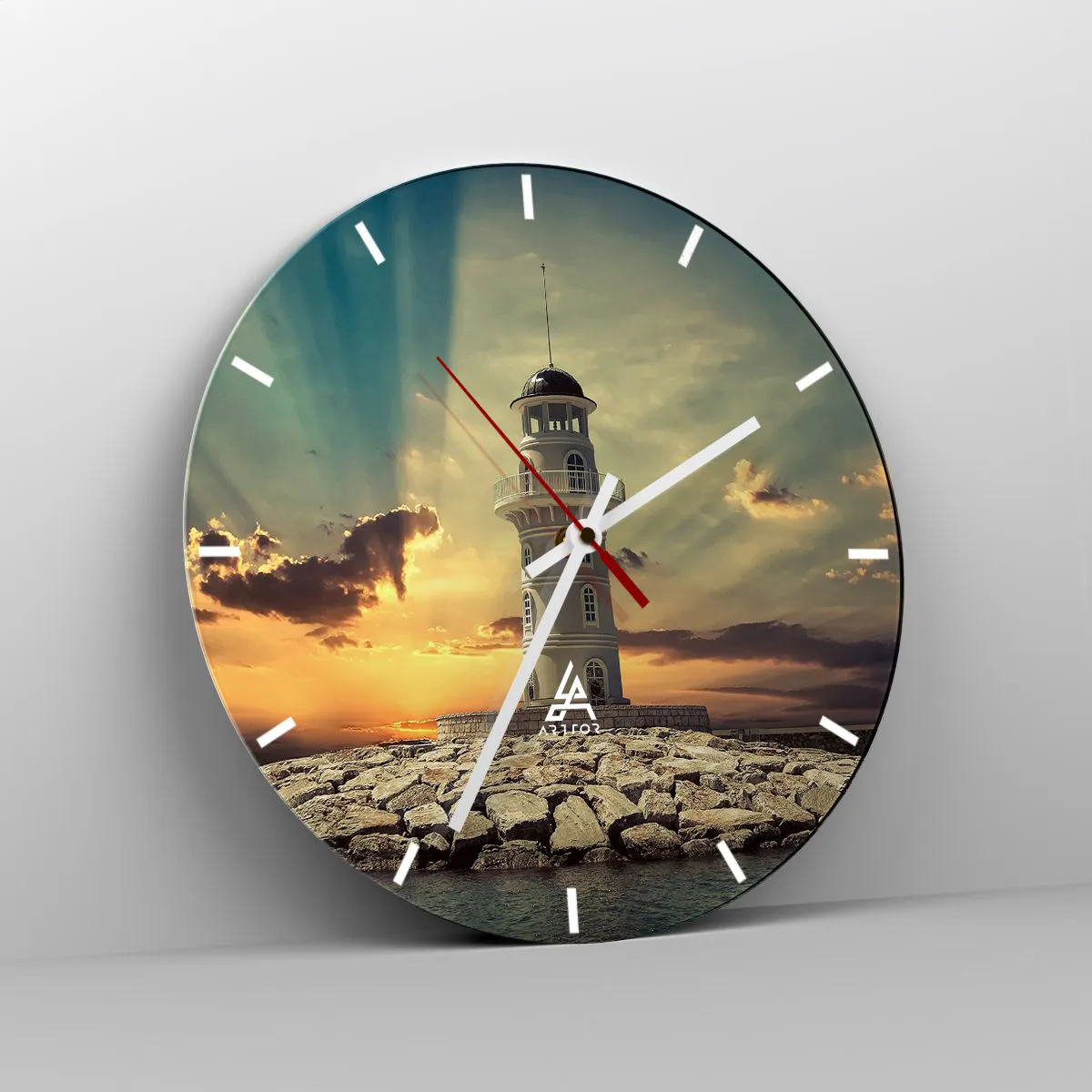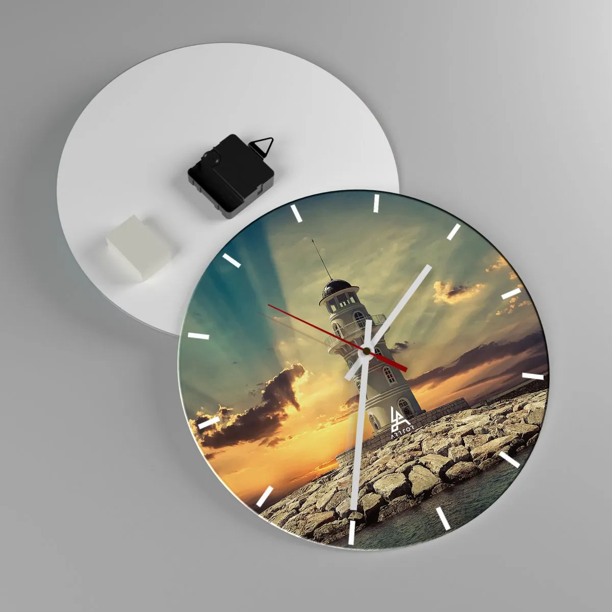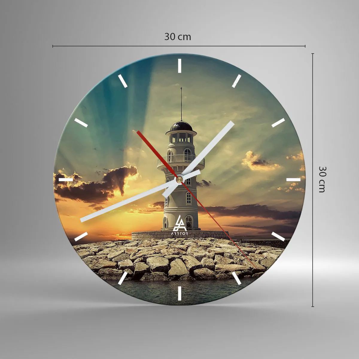 - Cette horloge murale présente un motif de phare sur fond de coucher de soleil. Elle est idéale pour un salon, un bureau ou une chambre. Son design rond mesure 30 x 30 cm.