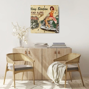 « Pin-up et voiture rétro » est une horloge murale unique de 30 x 30 cm qui nous replonge dans l'atmosphère des années 1950. Le motif représente une pin-up assise sur une voiture classique, entourée de détails rétro, comme des plaques d'immatriculation portant l'inscription « Route 66 ».