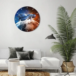 Une horloge murale au design futuriste, représentant une vue extraordinaire d'un vaisseau spatial planant au-dessus de la Terre, sur fond d'étoiles. Ce motif unique apporte une touche de modernité à votre intérieur et inspire l'exploration de mondes inconnus.