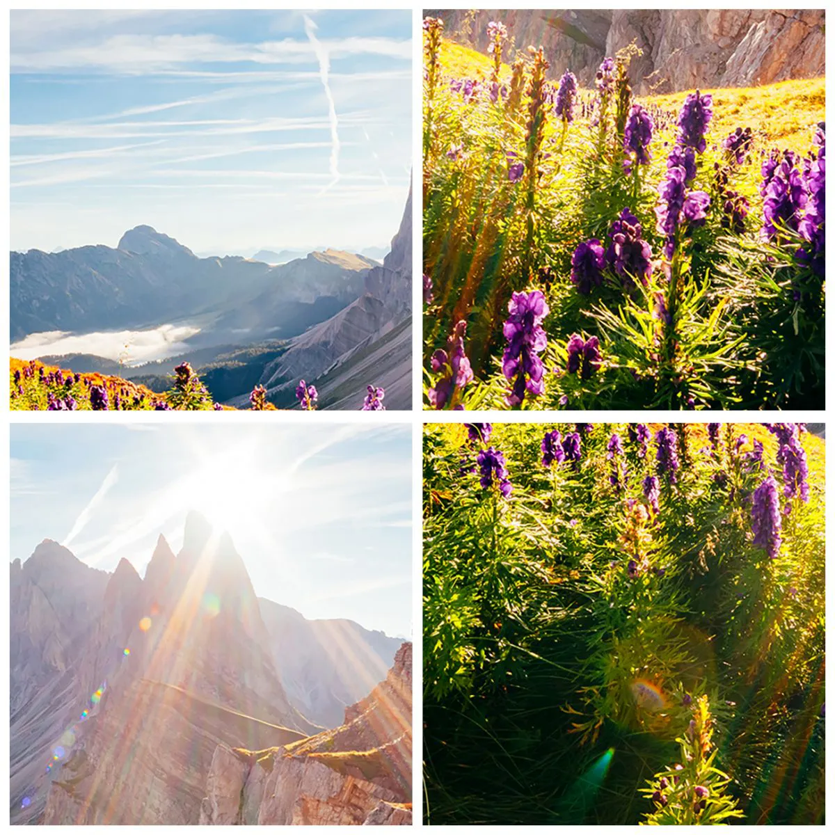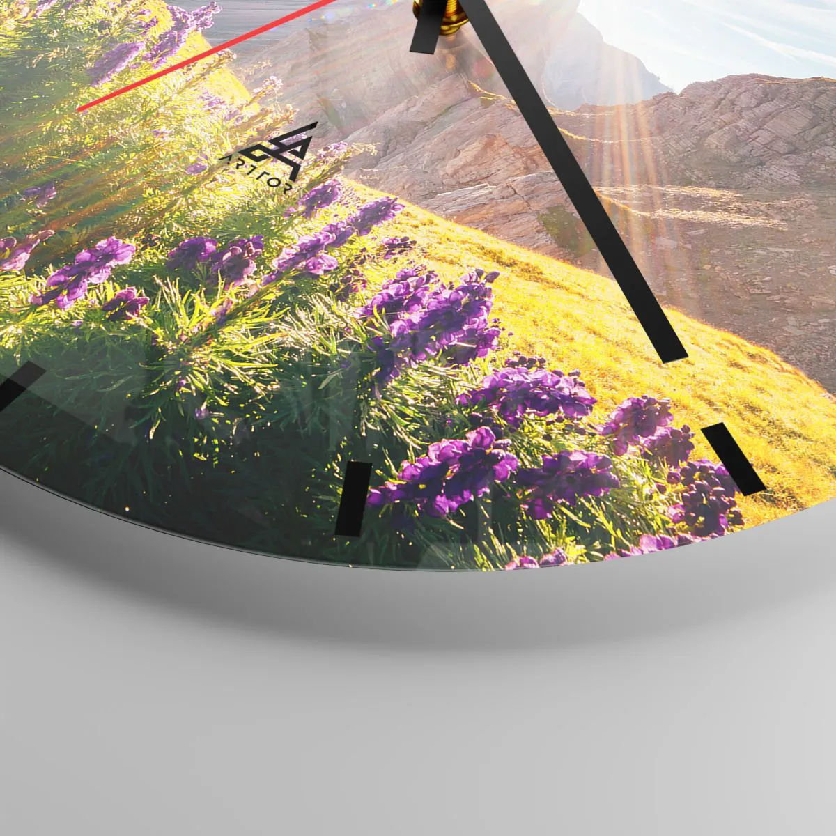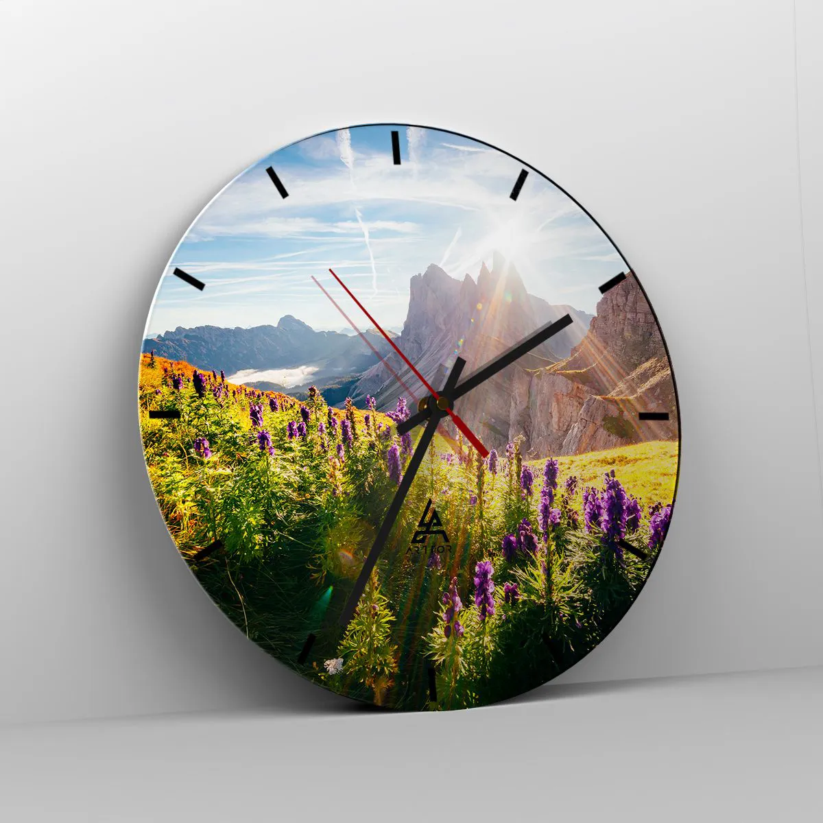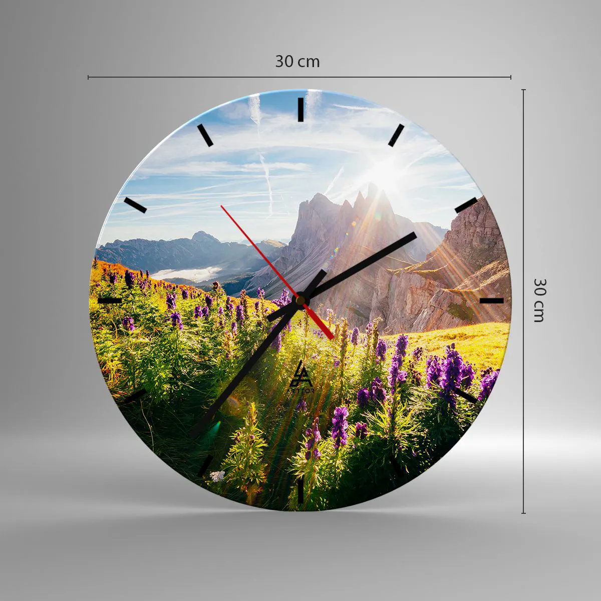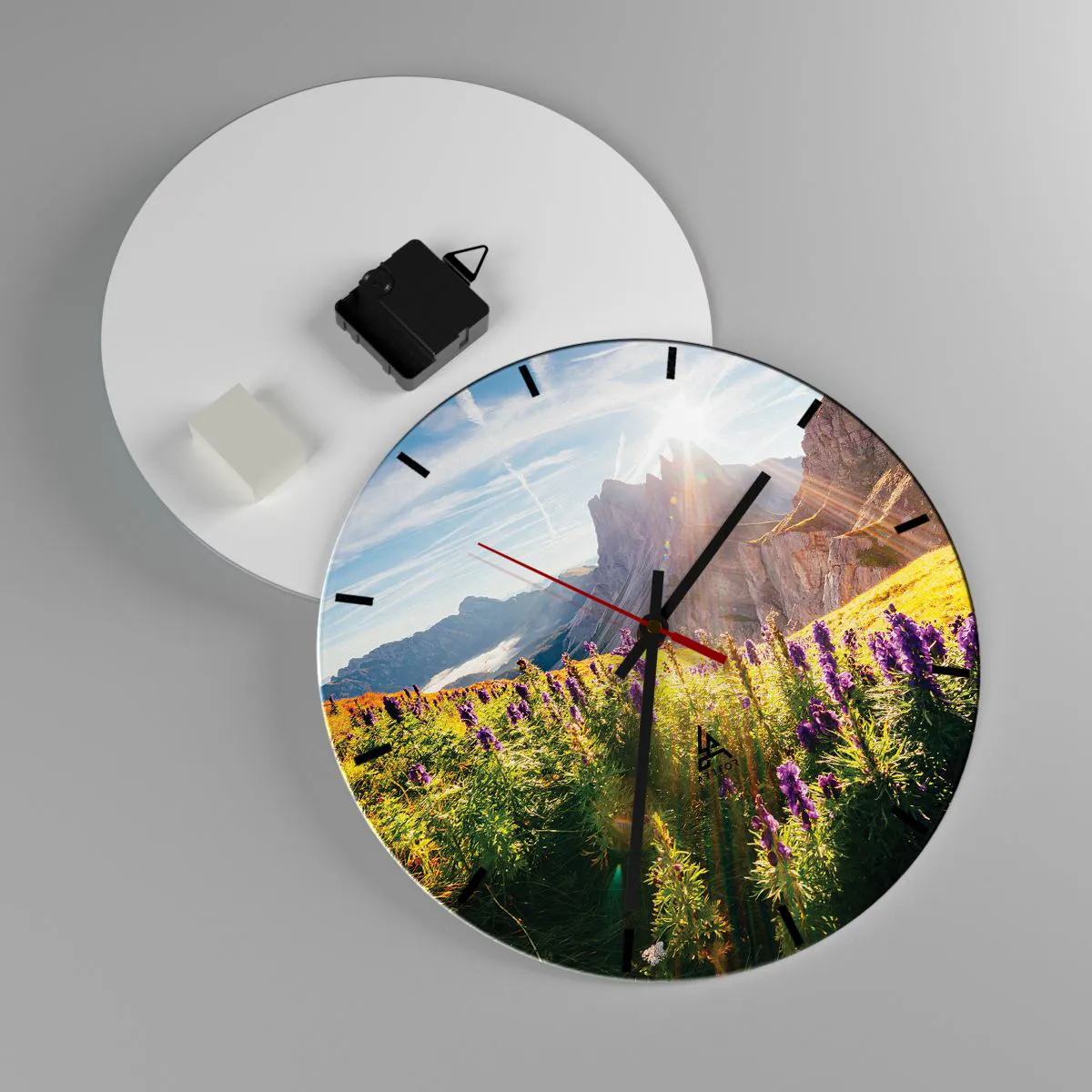 - Cette horloge murale circulaire de 30 x 30 cm représente des fleurs violettes dans une prairie de montagne illuminée par le soleil. Parfaite pour les intérieurs inspirés par la nature et l'harmonie.