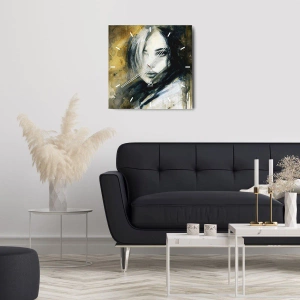 • Portrait de femme, visage de femme, graphisme, Personnes, Mode, Art, Pour la salle à manger, Pour le hall, Pour le salon, Pour la chambre, , Noir, gris, jaune, Carré