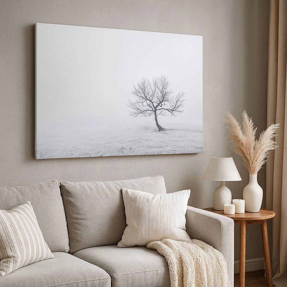 L'arbre, élément central du tableau, symbolise la force et la solitude, tandis que le brouillard environnant crée une atmosphère mystérieuse et apaisante. De subtiles nuances de blanc et de gris soulignent le caractère minimaliste de la composition, ce qui en fait un choix idéal pour les intérieurs modernes.