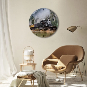 - Horloge murale ronde en verre de 30 x 30 cm. Paysage pittoresque avec une locomotive à vapeur traversant un pont au-dessus d'une rivière en montagne. Une scène pleine de mouvement, de nostalgie et d'inspiration voyage.