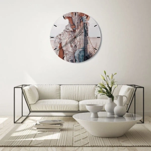 - Une horloge murale au style bohème revisité : une guitare, une plage et une femme en robe fleurie. Une composition artistique emplie de liberté et d'esprit estival, parfaite pour les intérieurs élégants et pleins d'âme.