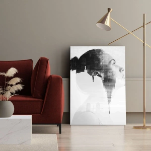 Impression sur toile - Image sur toile - Portrait d'une femme avec le contour d'une ville en arrière-plan, couleurs noir et blanc - 70x50cm - Des deux côtés du verre - Décoration murale moderne pour le salon et la chambre ARTTOR