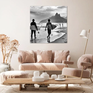 - Ce tableau en noir et blanc représente deux surfeurs marchant sur la plage avec leurs planches. En arrière-plan, montagnes et océan créent une scène harmonieuse qui s'intègre parfaitement aux intérieurs minimalistes et modernes.