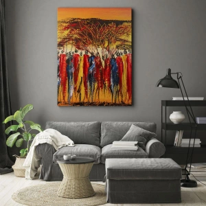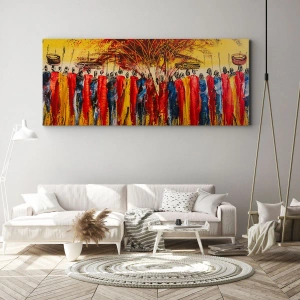 Impression sur toile - Image sur toile - Une scène colorée avec des personnages africains sur fond de soleil couchant. - 120x80cm - Là-bas, là-bas, ils vont là-bas - Décoration murale moderne pour le salon et la chambre ARTTOR