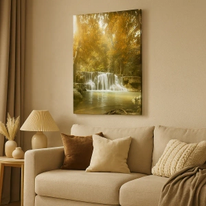 La toile « Paysage d'automne avec cascade » transporte le spectateur dans un univers naturel paisible, dominé par les couleurs dorées de l'automne. La scène représente une cascade pittoresque entourée d'arbres majestueux aux feuilles jaune-orange chaudes. Les rayons du soleil pénètrent doucement les fourrés, créant une atmosphère magique de paix et d'harmonie.