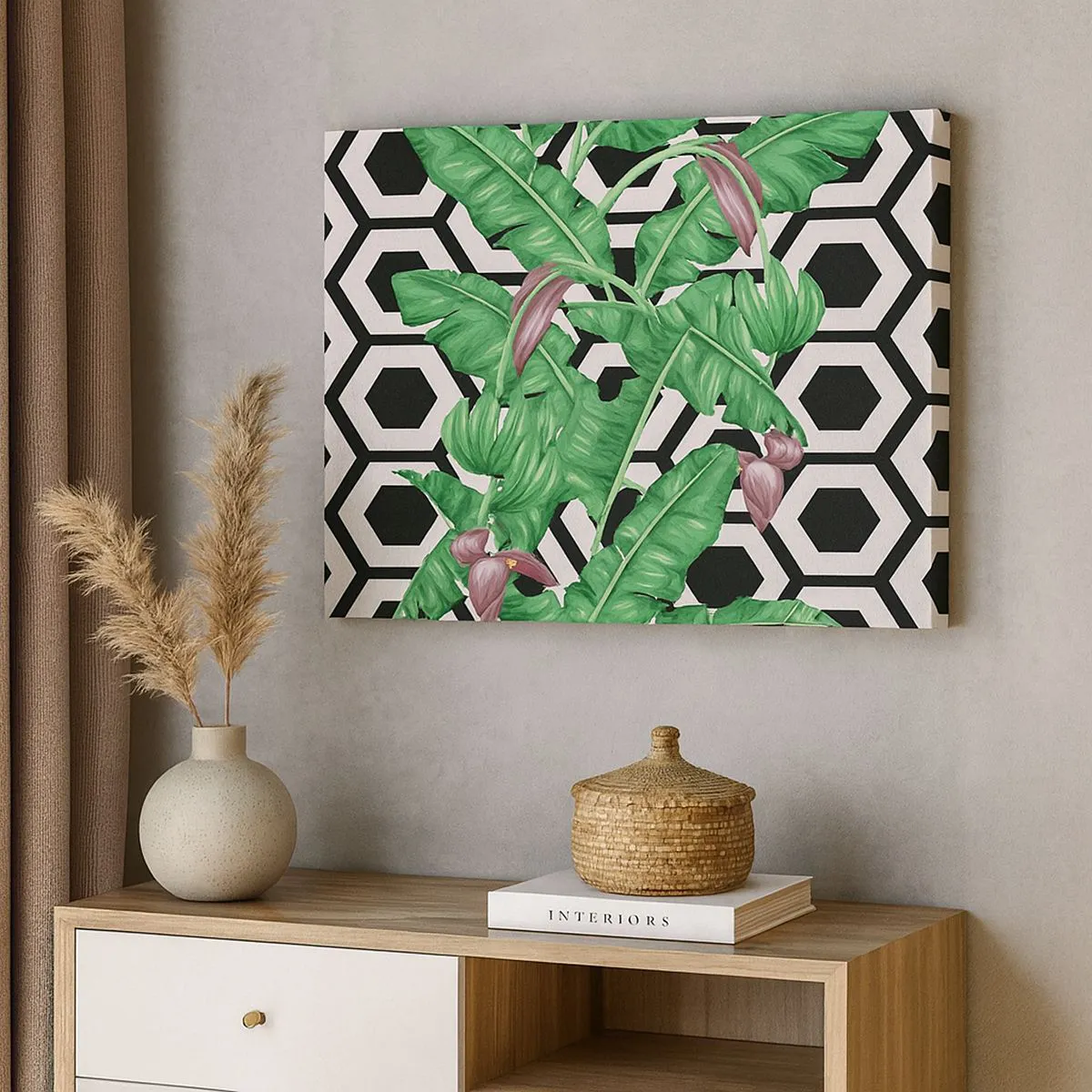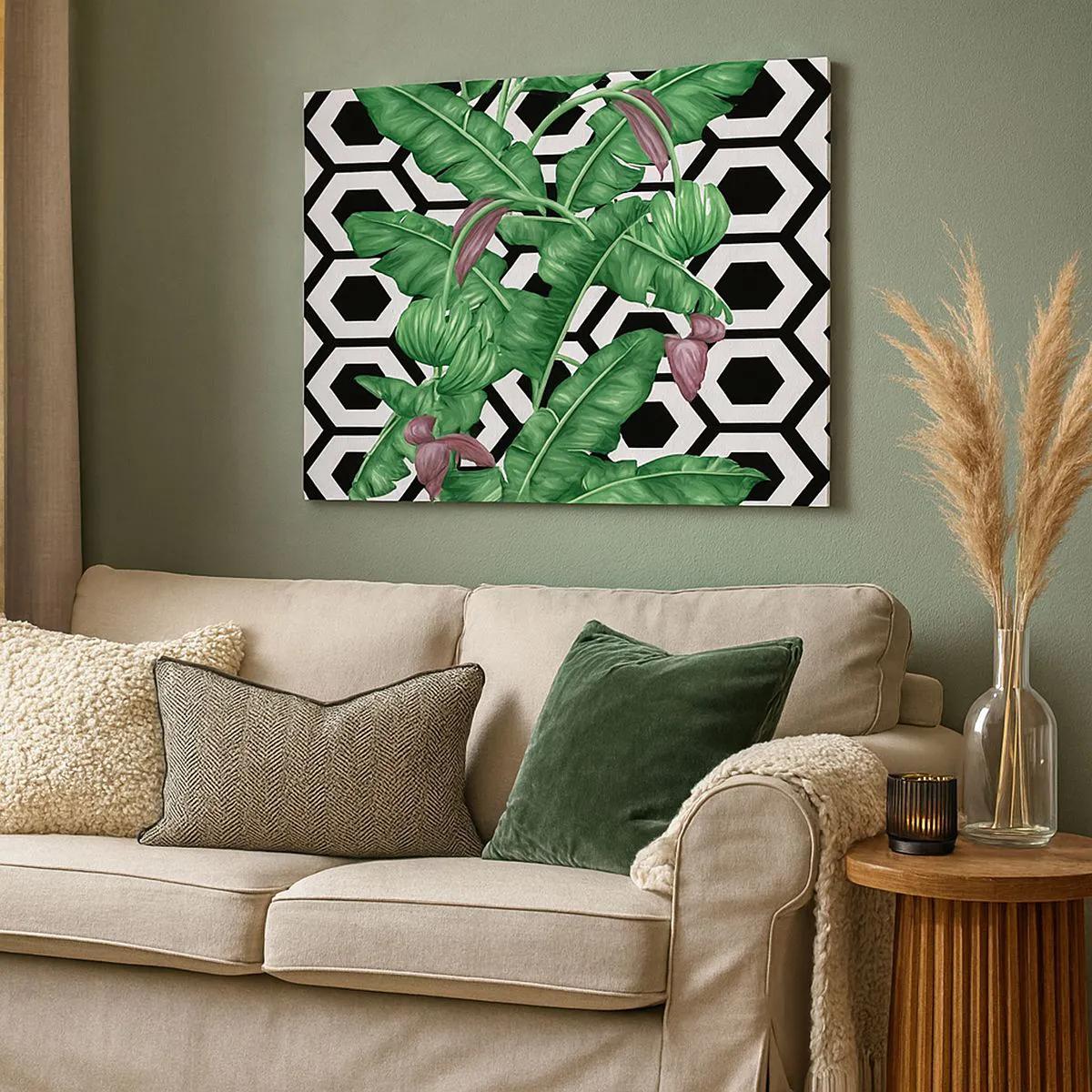Impression sur toile - Image sur toile - Feuilles tropicales sur fond géométrique - 100x70cm - Une composition symétrique par nature - Décoration murale moderne pour le salon et la chambre ARTTOR