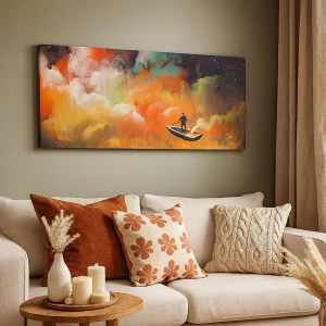 Impression sur toile - Image sur toile - Une silhouette dans un bateau sur un fond de nuages colorés - 100x70cm - En bateau à travers la galaxie - Décoration murale moderne pour le salon et la chambre ARTTOR