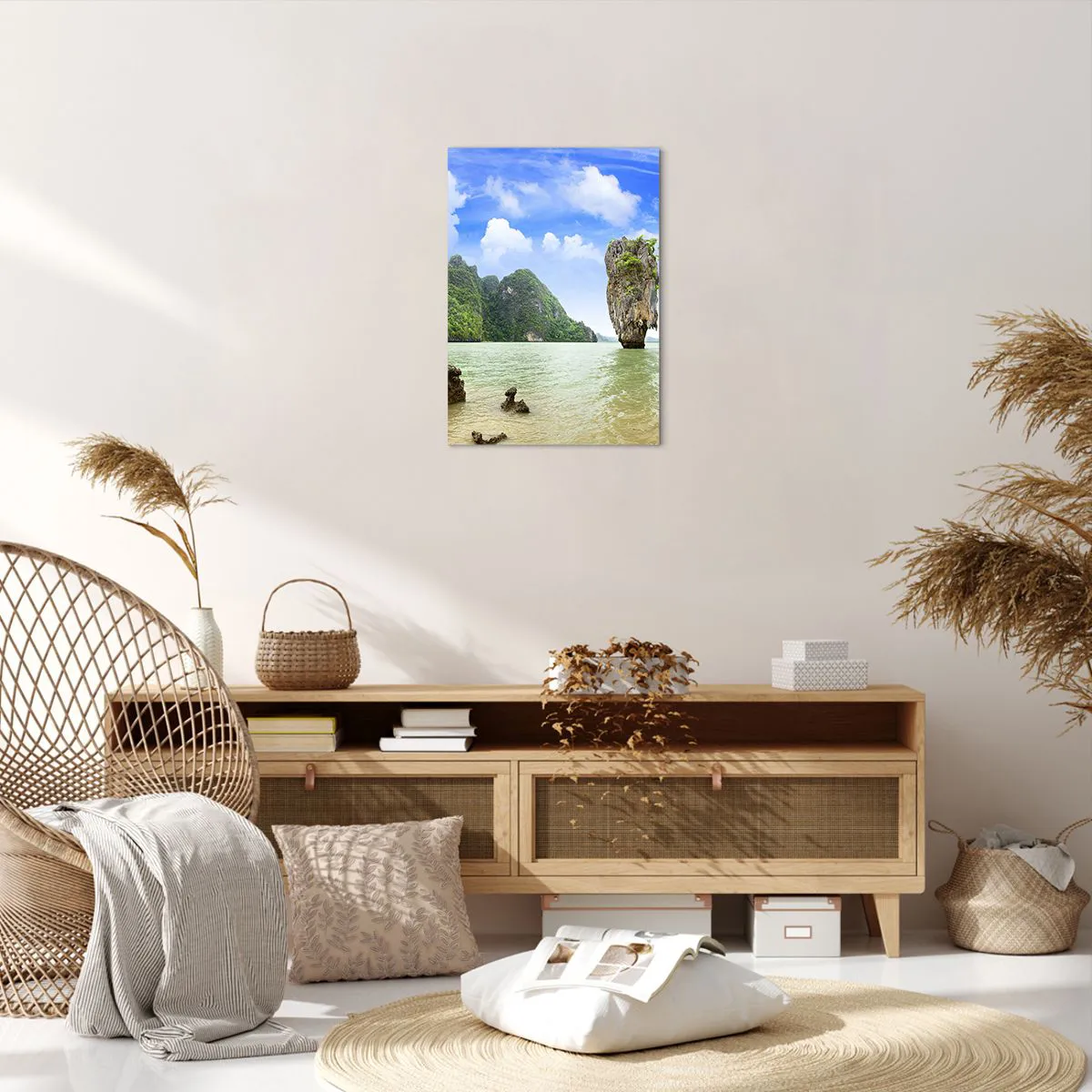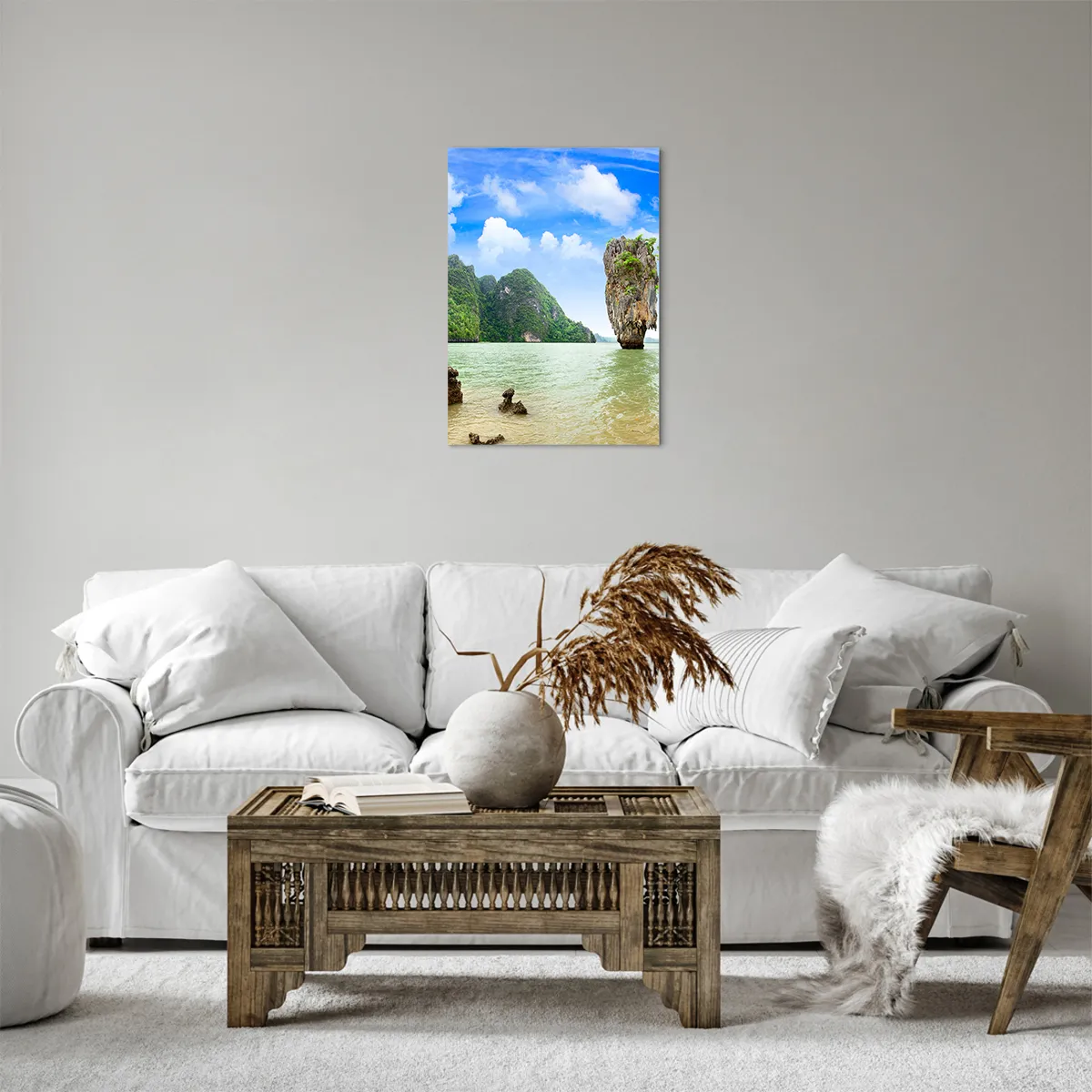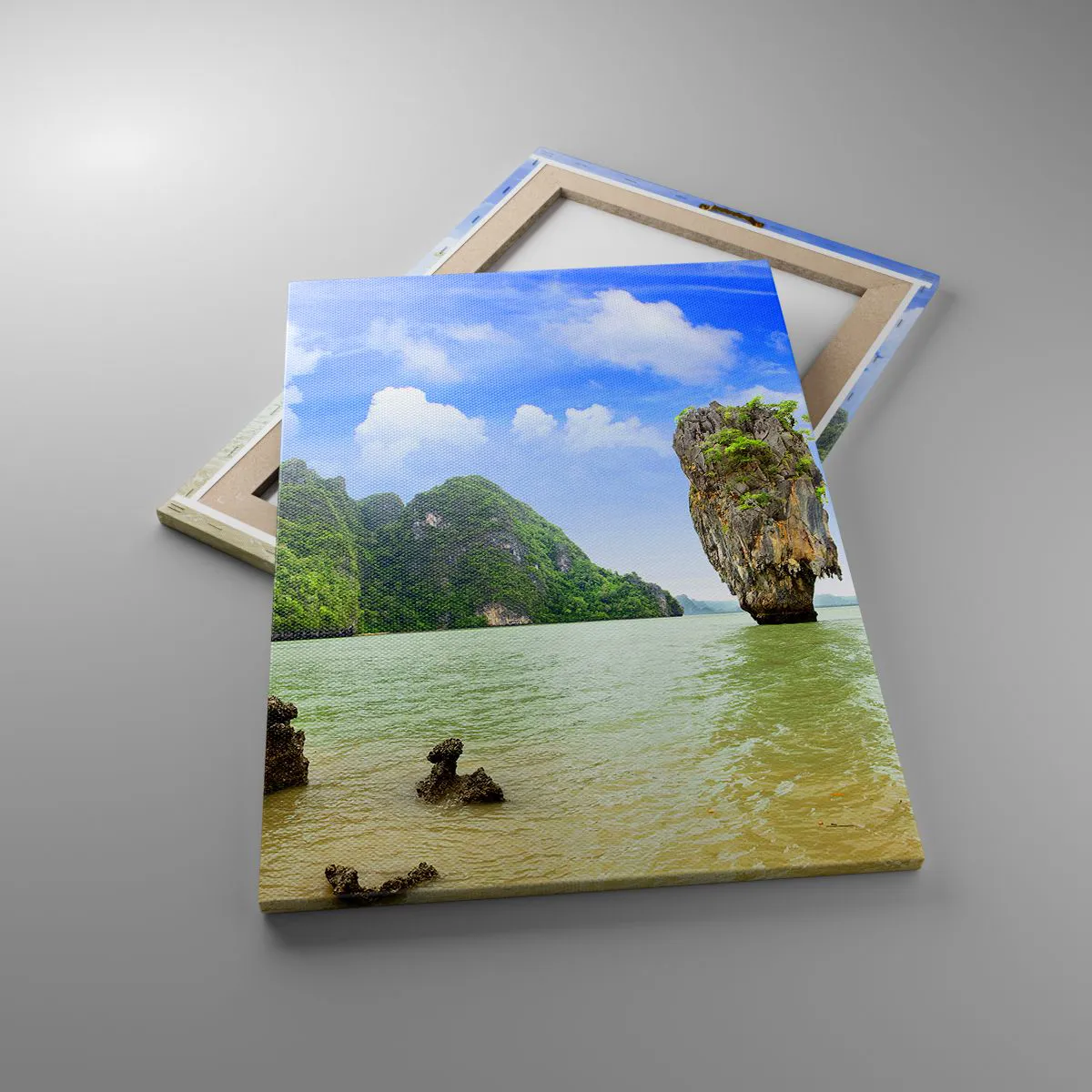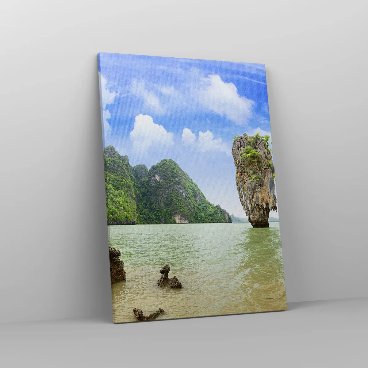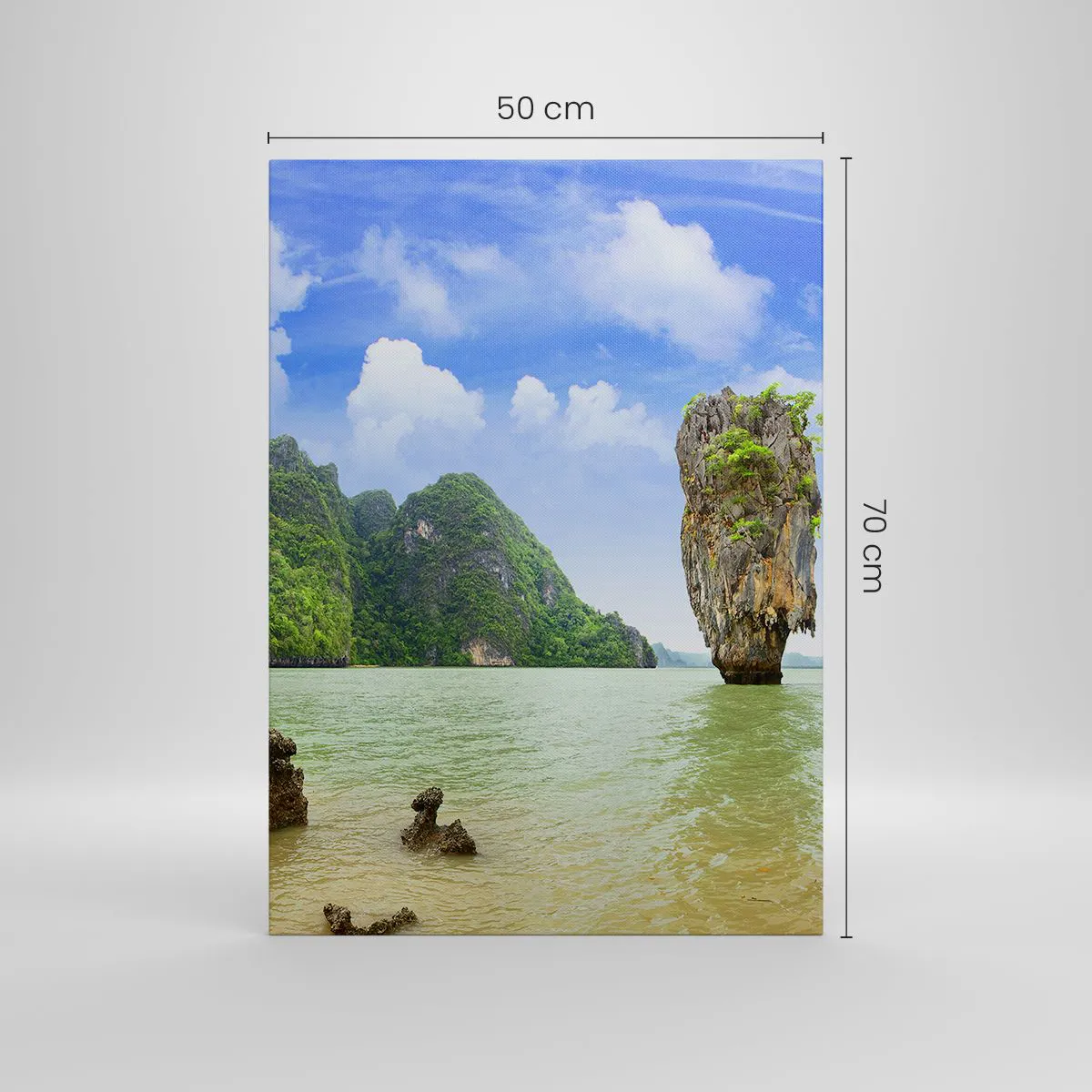 Impression sur toile - Image sur toile - Une formation rocheuse exotique entourée d'eau et de verdure sous un ciel bleu. - 50x70cm - Merveilles rocheuses de la nature - Décoration murale moderne pour le salon et la chambre ARTTOR