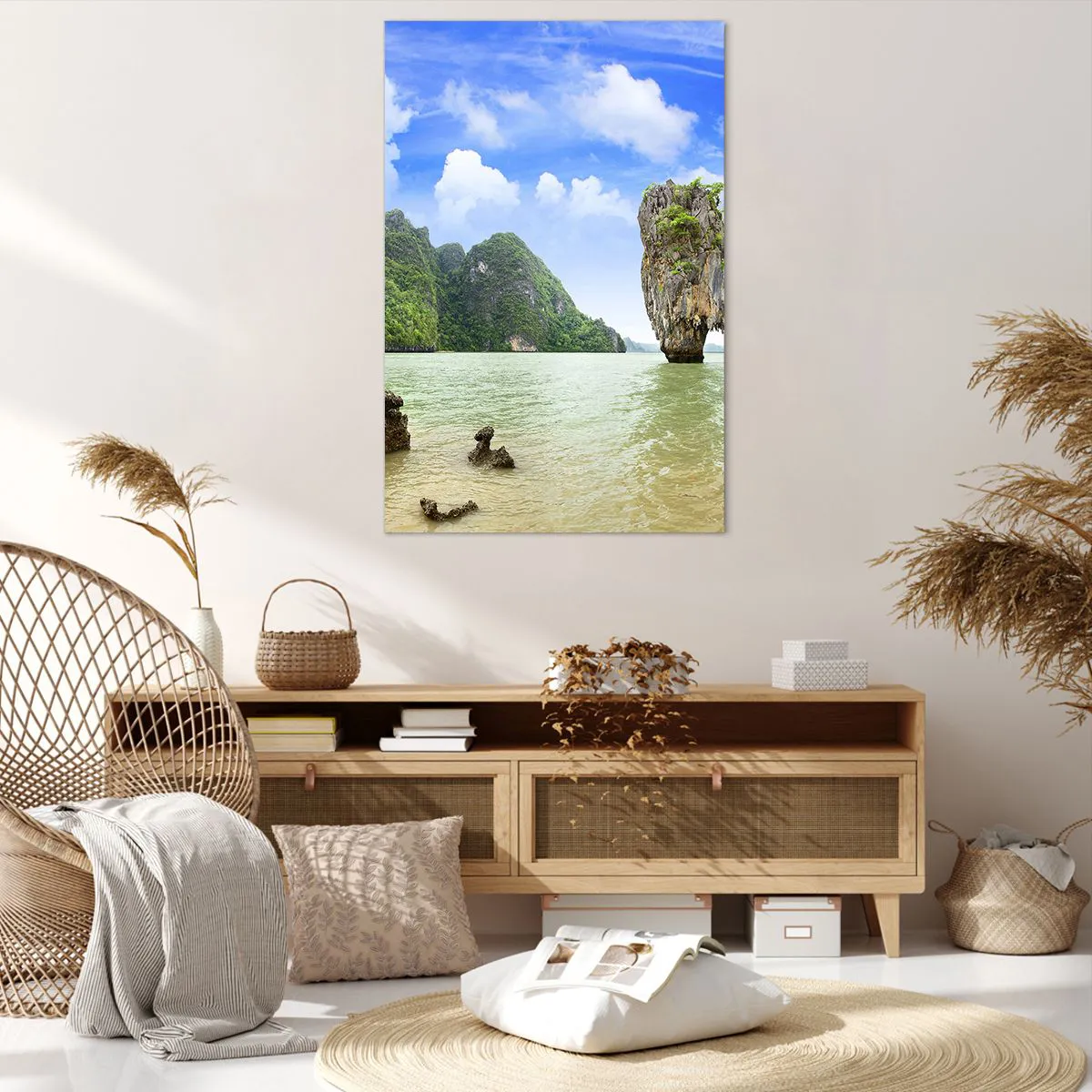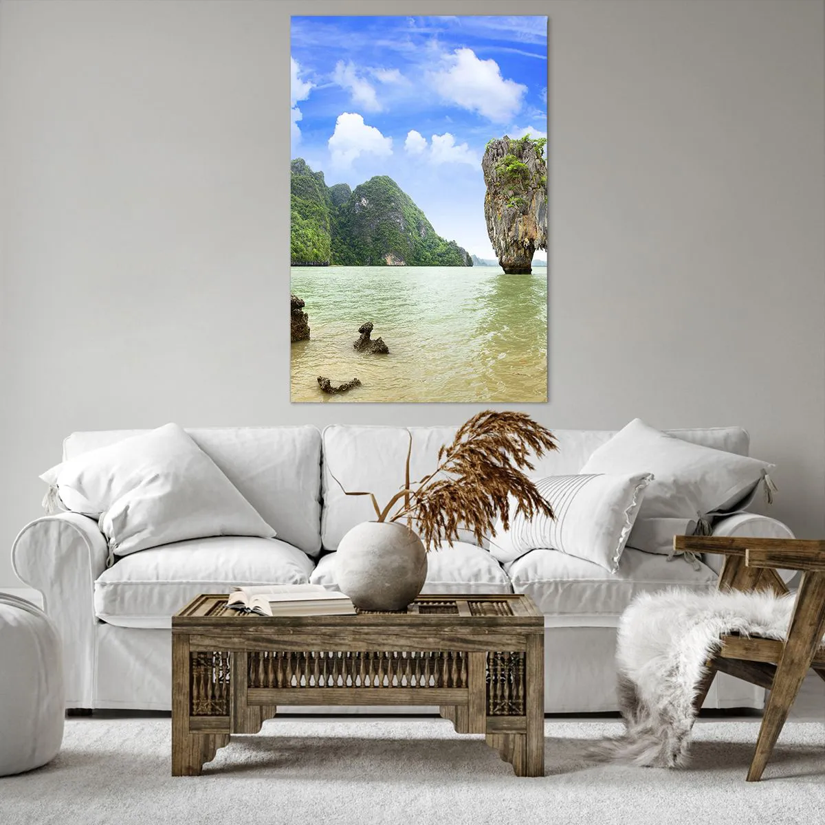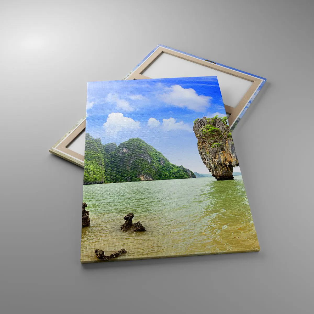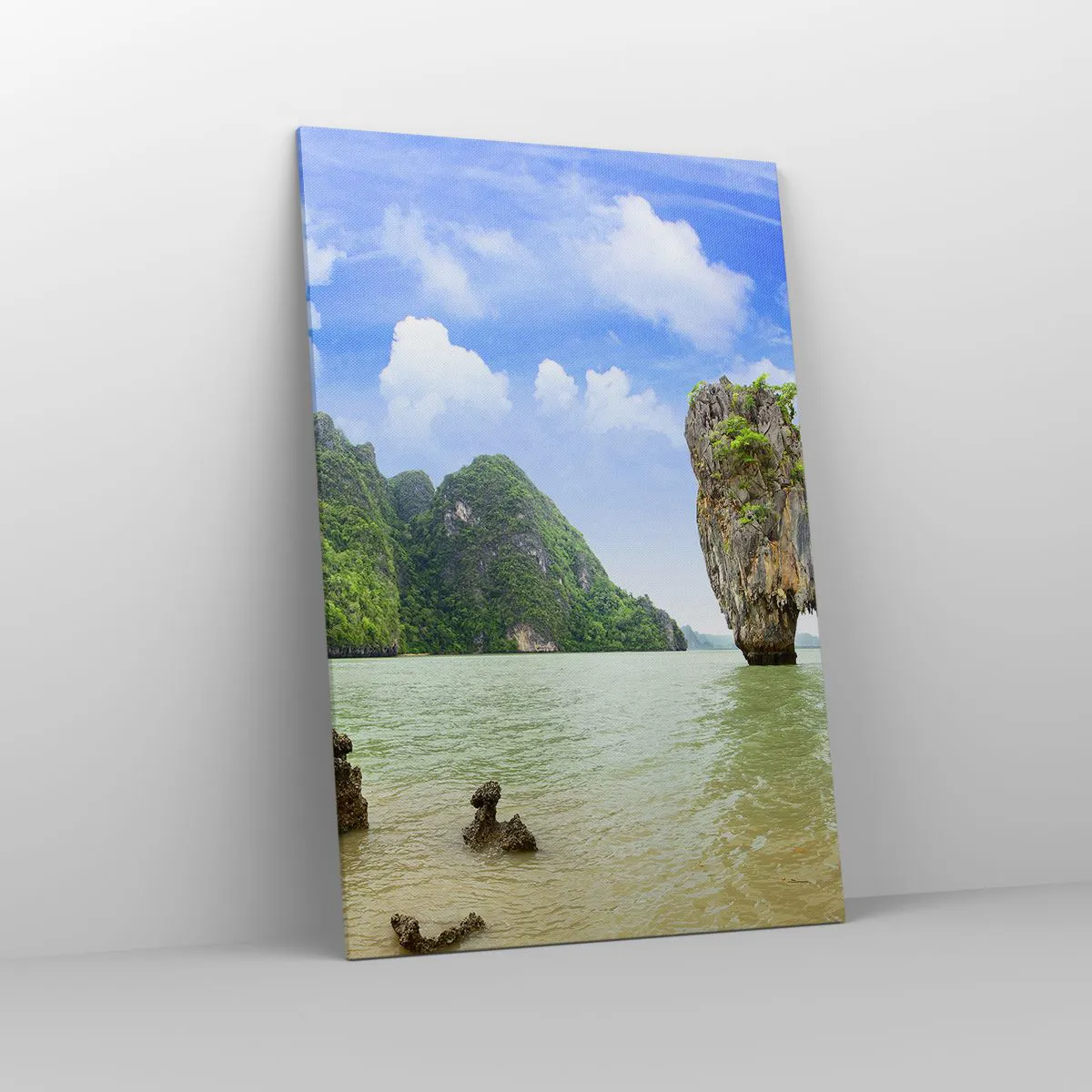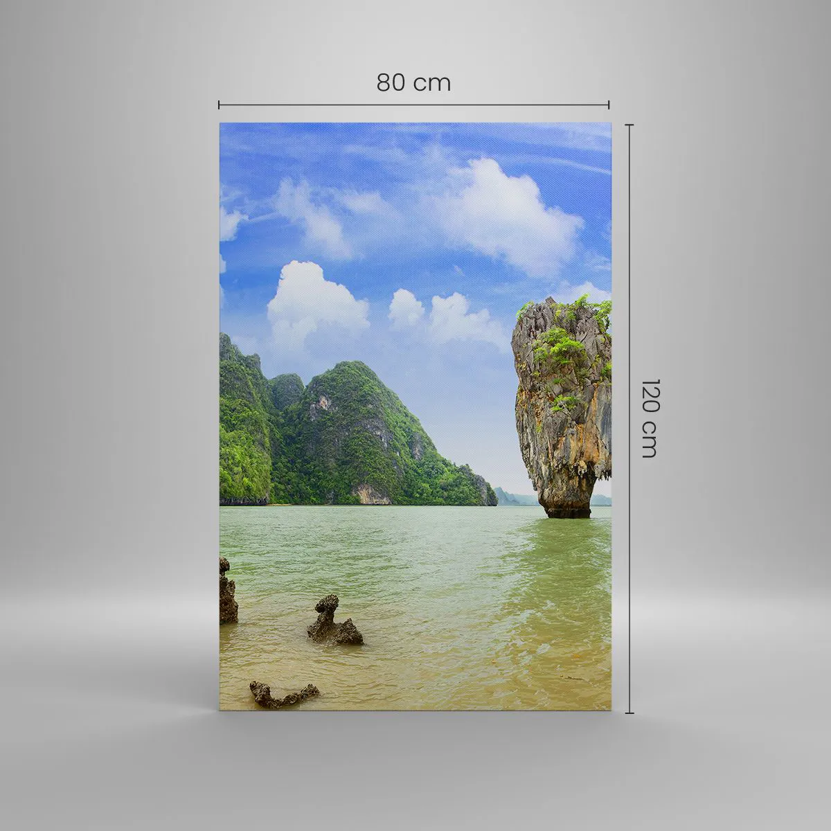 Impression sur toile - Image sur toile - Une formation rocheuse exotique entourée d'eau et de verdure sous un ciel bleu. - 80x120cm - Merveilles rocheuses de la nature - Décoration murale moderne pour le salon et la chambre ARTTOR