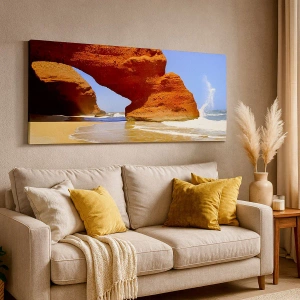 Impression sur toile - Image sur toile - Une arche rocheuse naturelle sur une plage avec un ciel bleu et des vagues - 50x70cm - L'eau et le vent depuis des milliers d'années - Décoration murale moderne pour le salon et la chambre ARTTOR