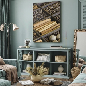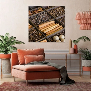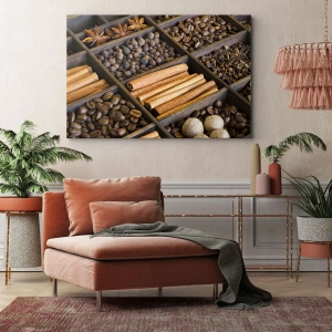 Impression sur toile - Image sur toile - Épices et café dans des compartiments en bois - 70x100cm - Trésor d'arômes - Décoration murale moderne pour le salon et la chambre ARTTOR