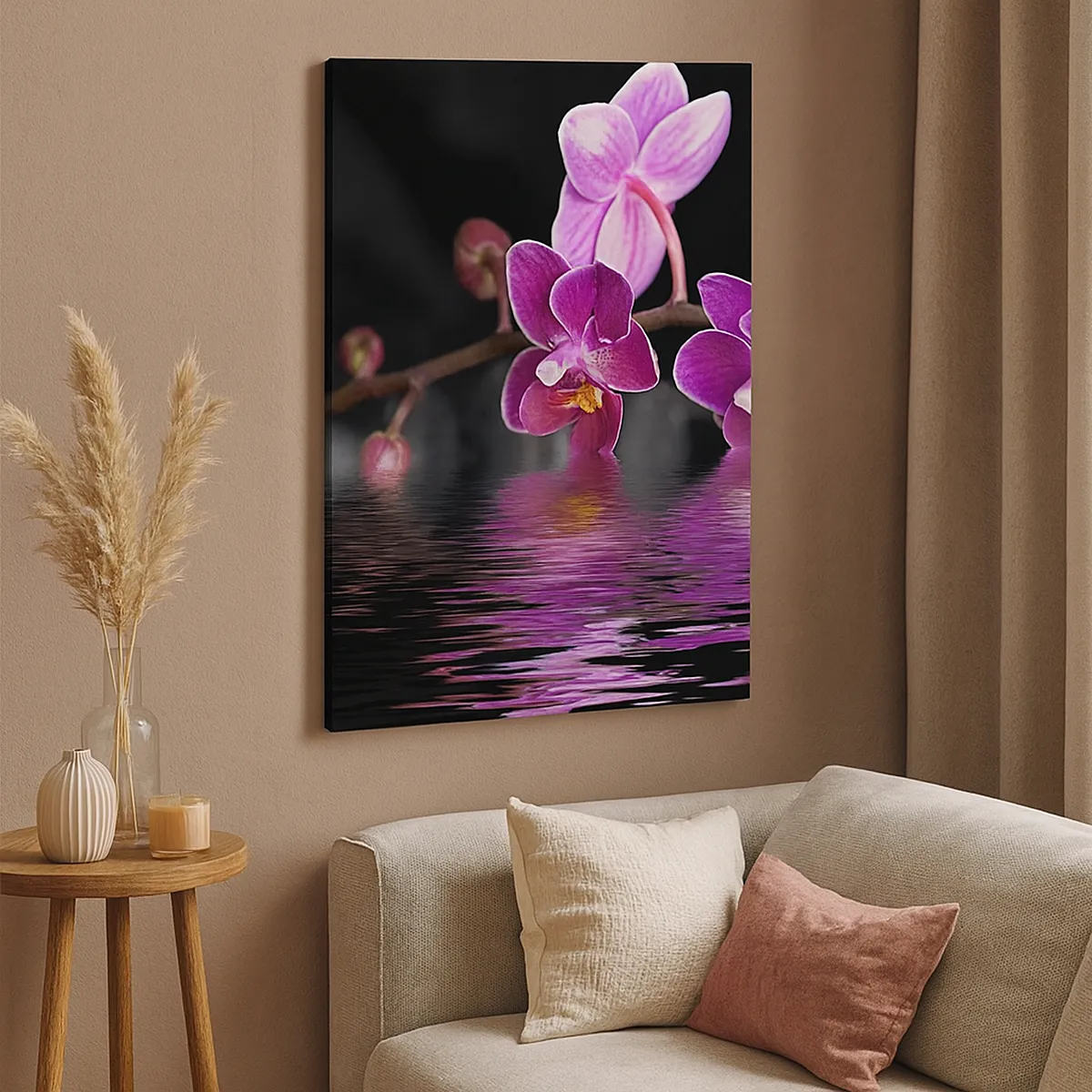 Impression sur toile - Image sur toile - Orchidées violettes sur une eau calme sur fond noir - 70x100cm - Reflet lilas de la beauté - Décoration murale moderne pour le salon et la chambre ARTTOR