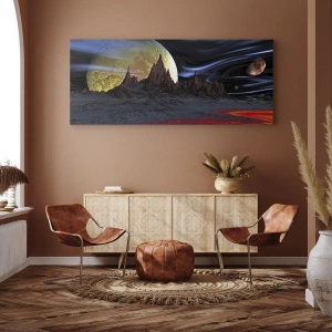 Impression sur toile - Image sur toile - Un paysage fantastique avec des planètes et des paysages volcaniques - 80x120cm - Monde inconnu - Décoration murale moderne pour le salon et la chambre ARTTOR