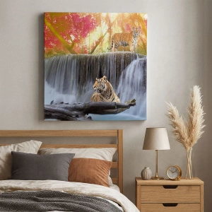 Impression sur toile - Image sur toile - Tigres près d'une cascade dans la forêt d'automne - 80x120cm - Paysage surréaliste - Décoration murale moderne pour le salon et la chambre ARTTOR