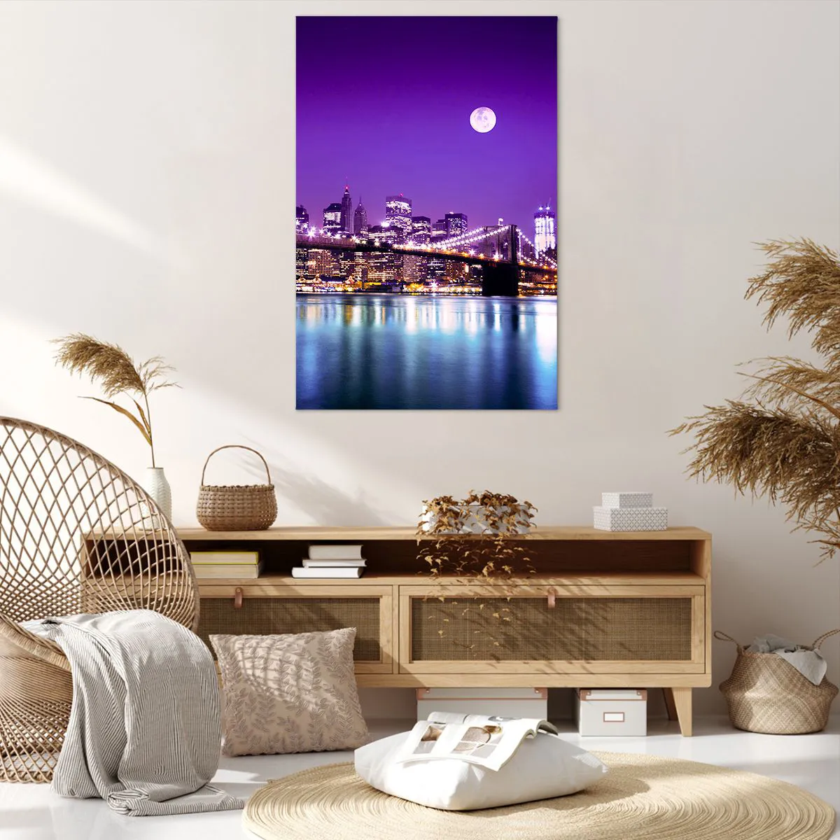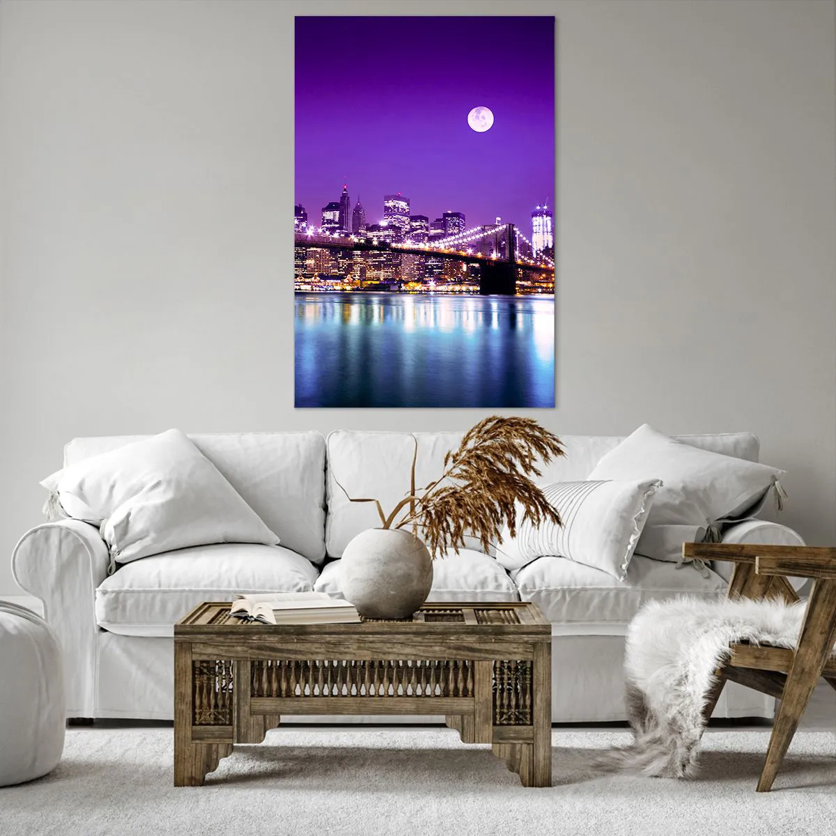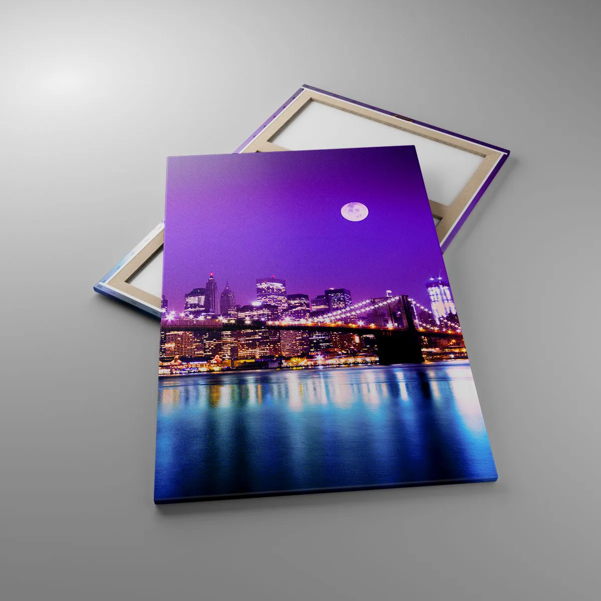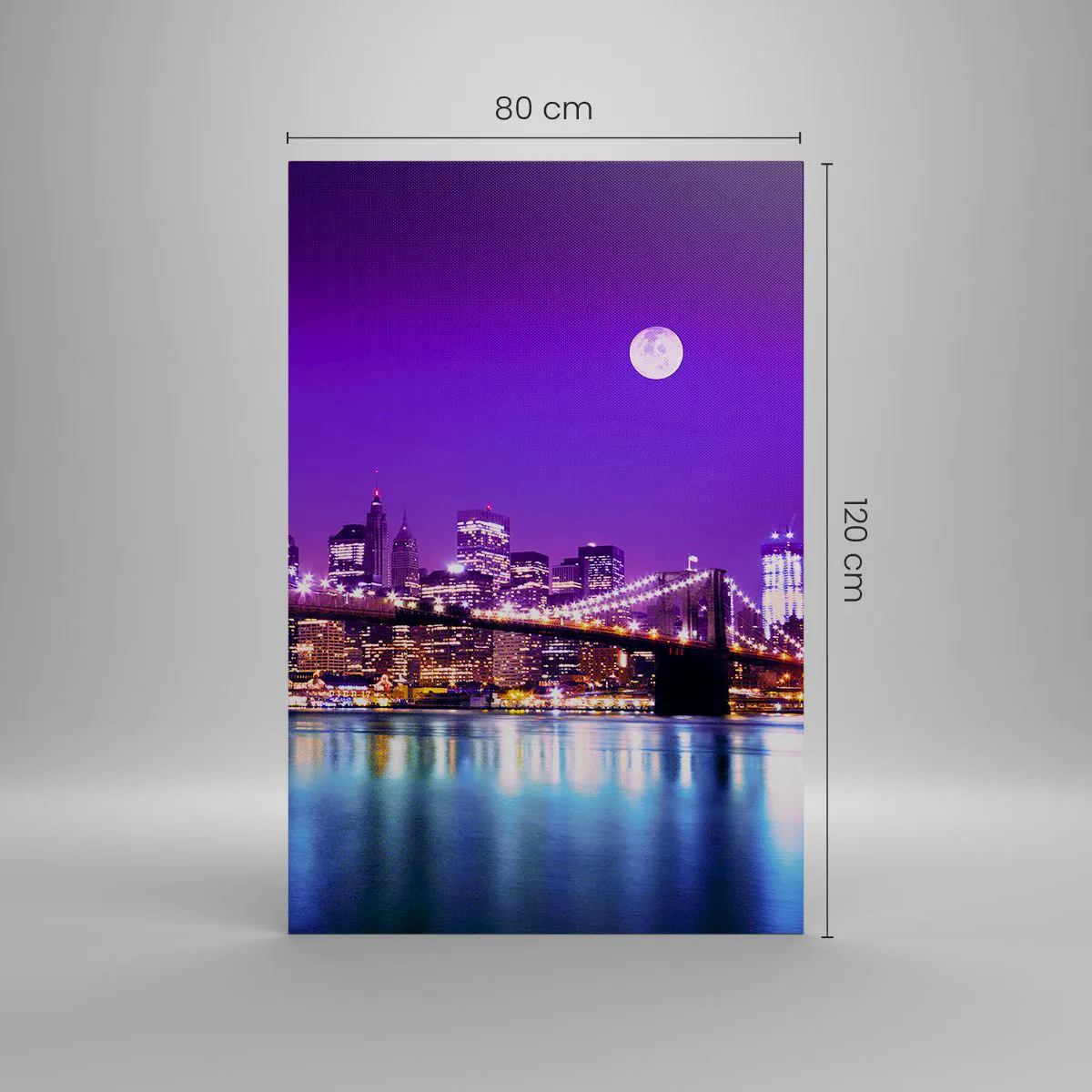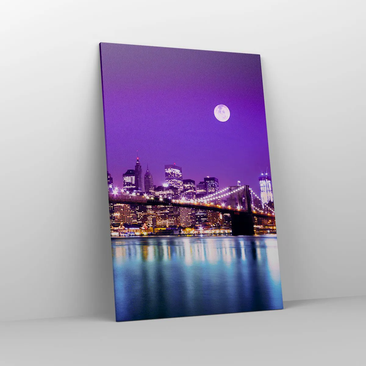 Impression sur toile - Image sur toile - Pont de Brooklyn la nuit avec la ville illuminée et la pleine lune - 80x120cm - Lumières de grande ville en violet - Décoration murale moderne pour le salon et la chambre ARTTOR